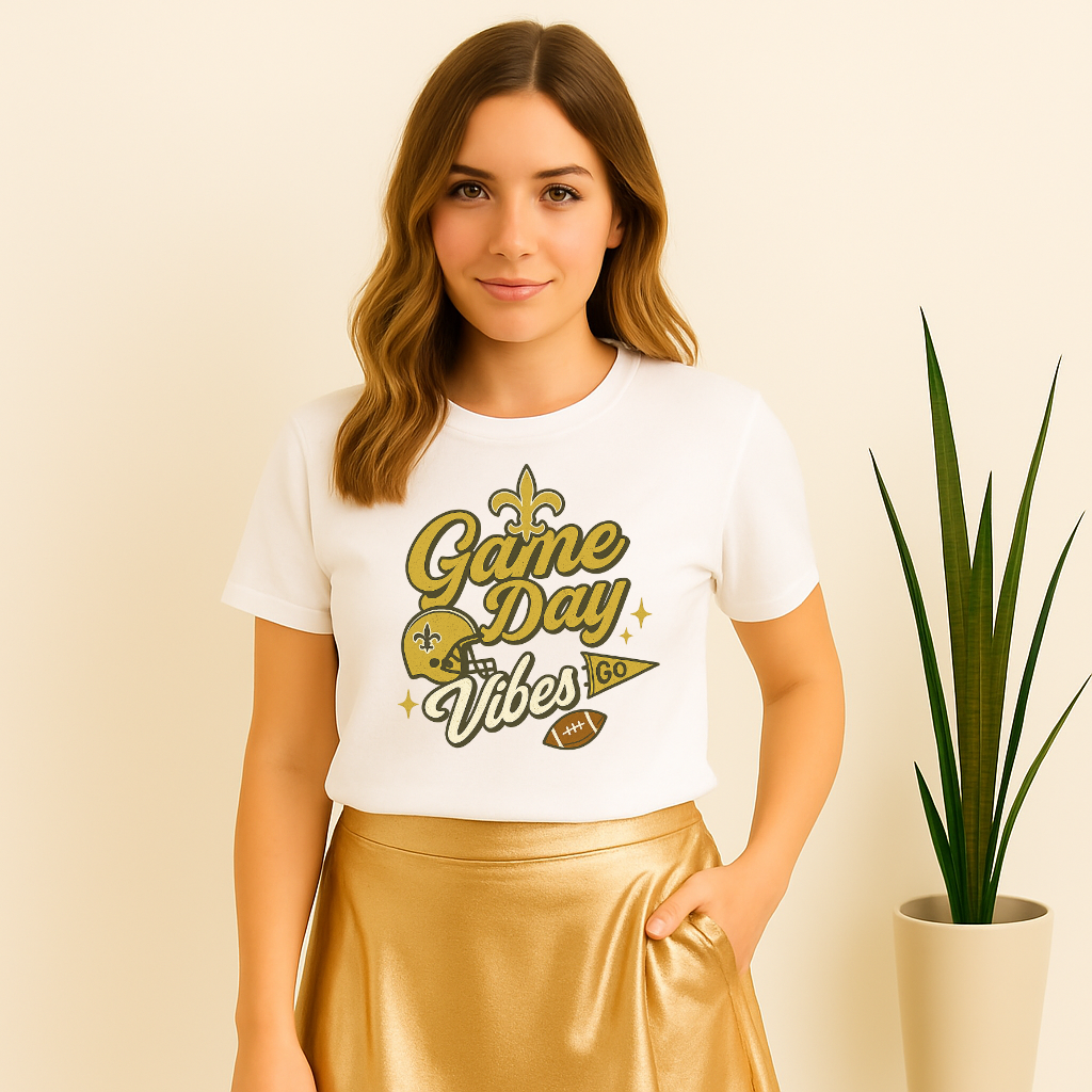 Rep your New Orleans pride with this vintage-inspired Game Day Vibes T-shirt! Featuring a distressed gold script design with a fleur-de-lis, football helmet, and game ball, it’s the perfect shirt for every fan who lives for Sundays in the Dome.